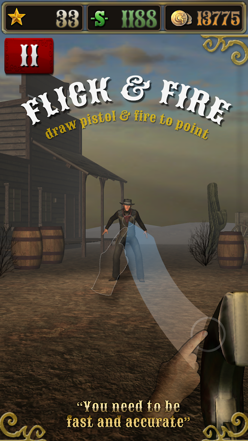 O tutorial é rápido e fácil, e você pode aprender o jogo em poucos minutos. O sistema Flick Fogo não é complicado de usar, e pode ser aprendido rapidamente. Dominando o jogo é outro assunto, e levará uma vida. Você precisa de reflexos rápidos e habilidade, porque este jogo é um desafio! Depois de concluir o tutorial, siga para o campo de treinamento e atirar em alguns frascos alinhados em uma cerca e trabalhar em sua precisão. As garrafas não estão levando seis armas, assim que você é mais seguro praticando em algo que não vai atirar de volta. Quando se sentir pronto, pegue o seu revólver e testar suas habilidades em um duelo. Esteja avisado! Os bandidos não só retornar o fogo, eles também são rápidos empates. Você vai ter sorte para escapar de um duelo com a sua vida.